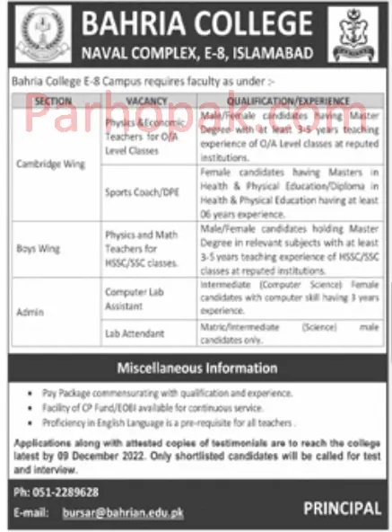 Bahria College Navel Complex Islamabad Jobs 2022-23