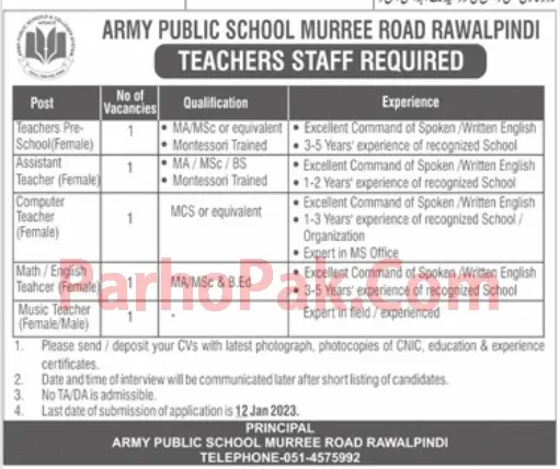 Army Public Schools APS Rawalpindi Jobs 2023 for Muree Road Campus