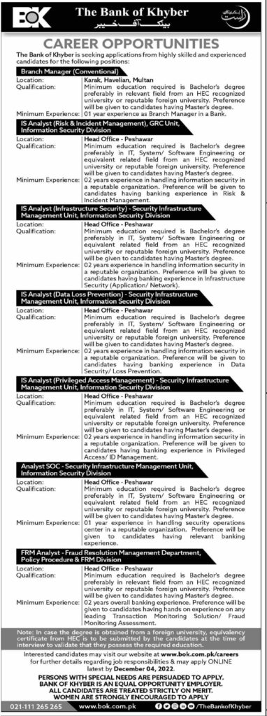 Bank of Khyber BOK Jobs 2022 Apply Online Details